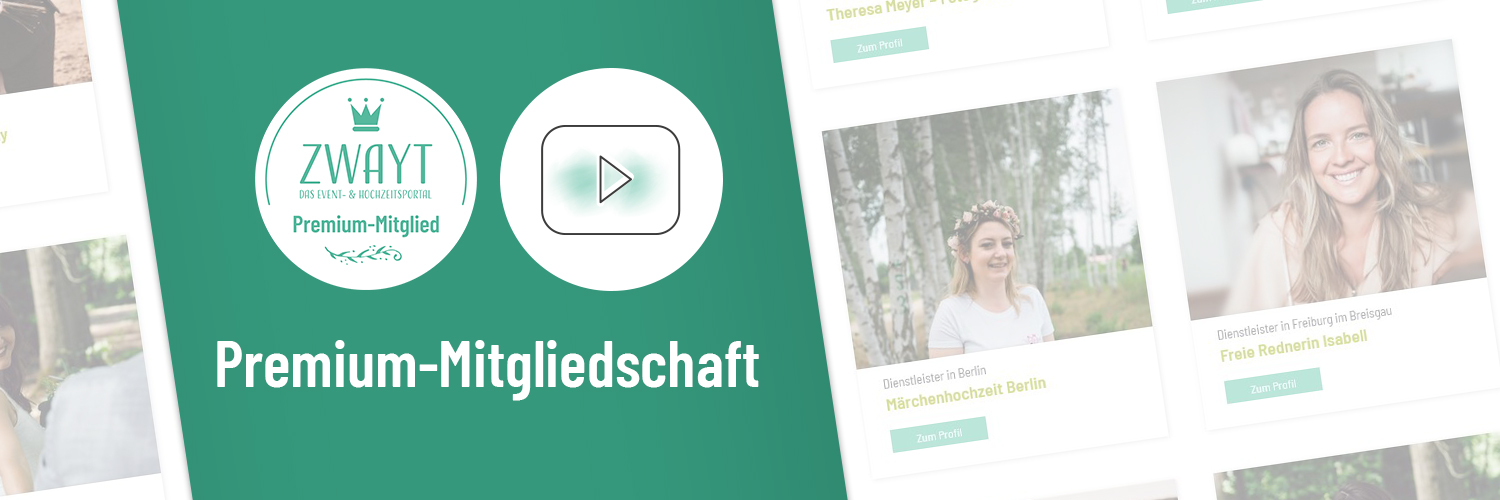 In diesem Video erklären wir euch Schritt für Schritt den Vorgang wie ihr eure Premium-Mitgliedschaft beantragt und welche Vorteile ihr mit eurem Premium Profil auf unserem Event- & Hochzeitsportal ZWAYT habt.