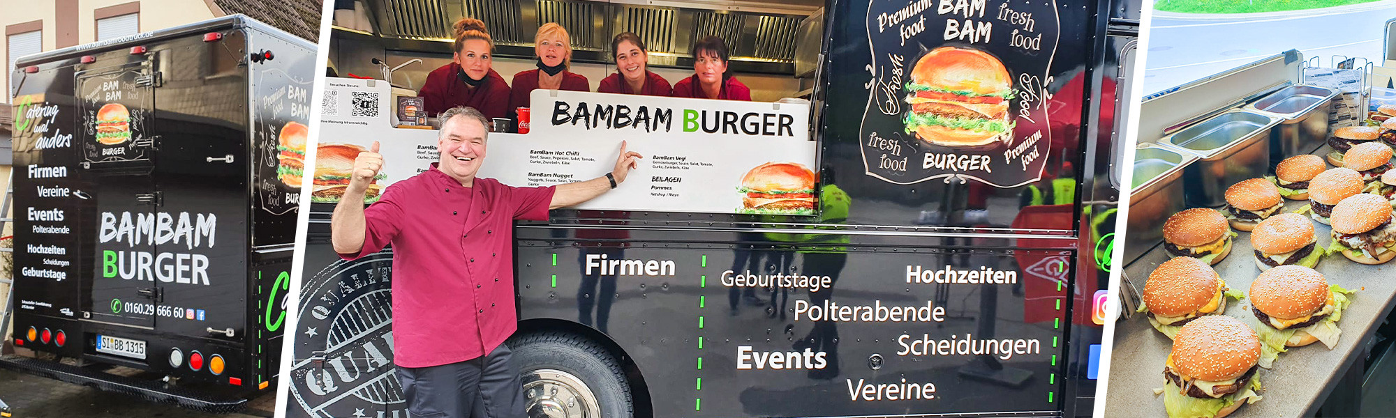 BamBam Burger ist der erste mobile Burgertruck in Kreuztal und Umgebung. Neben unseren üblichen Orten an denen Ihr uns täglich findet, bieten wir ausserdem einen umfangreichen Cateringserivce für Firmenfeiern, Geburtstage, Vereinsfeiern, Events, Polterabende, Hochzeiten und sogar für Scheidungen an.